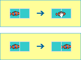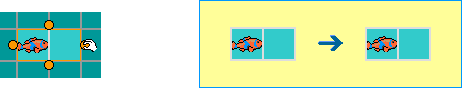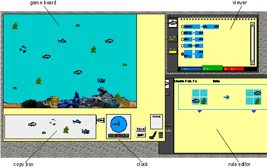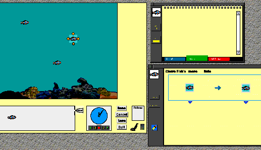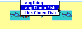 Now when we start the clock, the clown fish we just modified and all clown fish on the game board start moving to the right. The reason all clown fish move is that we have found that children expect that things that look the same will behave the same. Thus we have changed our rule paradigm from associating rules with individual objects to associating rules with classes of objects. The "class" object is the one in the copy box. Copies made of it are instances of that class.