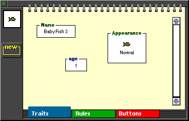 The first thing we'll do is give baby fish an "age" property. We turn to the "traits" (properties) page of the baby fish's viewer. We create a new property in it by clicking on the New Property button. We'll call the new property "age" and give it a value of "1":