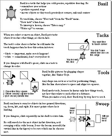 Metamouse helps users express their intent through a "teaching" metaphor. Users teach a graphical turtle named Basil. (Throughout this chapter "Basil" refers to the agent perceived by the user and "Metamouse" to the underlying system.) To teach effectively, users must appreciate Basil's limited powers of perception and inference. A brief "biography" (shown in Figure 1) introduces new users to the way Basil learns about spatial relations in terms of touch (the basis of graphical construction). In use, the system shows its focus by moving the turtle to the location of each edit, highlighting the things it senses.