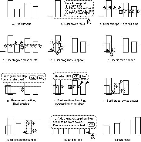 (Note that the scenario outlined above is a bit fanciful: Metamouse is only an experimental system residing in a very simple editor for boxes and lines.) Figure 2 shows a trace of Pam teaching Basil to sort boxes.