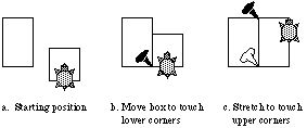 Metamouse does not do partial matching (which implies generalizing classes over multiple examples). We tested this idea in a pilot project but found that partial matching heuristics lead to over generalization and consequent false predictions unless additional information such as procedural context (i.e. preceding and following actions) is considered. Another strategy, in which raw, ungeneralized actions are matched with generalized classes, surprisingly proved unsatisfactory when we tested it. The match did not consider the "significance rating" of touches in the new action (since determining this would amount to generalizing) and as a result accepted many inappropriate matches. Figure 4 shows what can happen under this approach. The actions in frames b and c have a common touch (at the lower corners) which is significant in b but irrelevant in c; without testing for significance, however, touches in c would match all constraints in b.