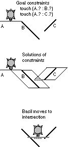The rules assign each touch to one of eight levels of significance. The highest level, "determining," specifies particular objects and points of contact, thus exactly determining where Basil should move (no touches like this occur in the action above, but the contact between the box and the spacer in Figure 3d is determining). Lower levels represent increasing degrees of freedom in the choice of coordinates, as when moving a line so that any part of it crosses some vertex: the constraints above are of this type. The lowest level, "trivial," hold by definition.