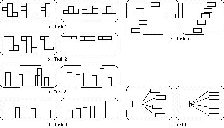 Task 1: Squeeze and align. Figure 6a. For each group of boxes, the user must squeeze the middle one and move the rightmost so that all align at the bottom. No extra objects need be created to construct this relationship. Basil can predict all steps after the user repeats one selection (for instance, after the user picks the second box, Basil will move it into place and continue with the third box).