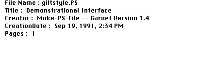 To help solve these problems, Gilt introduces the notions of Graphical Tabs and Graphical Styles into an interface builder, which are more completely described in [Hashimoto 92]. These are based on the styles and tabs in text editors such as Microsoft Word. A "graphical tab" is simply a horizontal or vertical position in the graphics window to which objects can be aligned. A "graphical style" is a named set of properties, which can be applied to widgets. The designer can edit a widget so it has the desired properties, select it, and then define a named style based on it. The values of the properties and the positions of the widgets will be associated with that style name. The style can then be applied to other widgets.