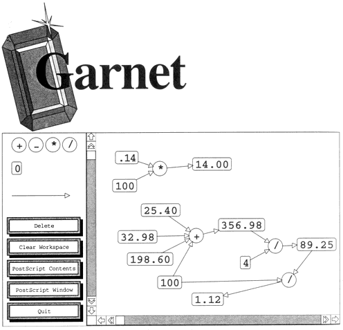 Typical applications created with Garnet include: drawing programs similar to Macintosh MacDraw, user interfaces for expert systems and other AI applications, box and arrow diagram editors, graphical programming languages, game user interfaces, simulation and process monitoring programs, user interface construction tools, CAD/CAM programs, etc. Garnet is in the public domain and is freely available. As of fall, 1992, over 30 projects around the world are using the system regularly. You can get Garnet by anonymous FTP from a.gp.cs.cmu.edu. Change to the directory /usr/garnet/garnet/ and retrieve the README file for instructions. Or you can send electronic mail to garnet@cs.cmu.edu. Garnet stands for Generating an Amalgam of Realtime, Novel Editors and Toolkits.