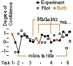 We tried to objectify users' impressions about the ease or difficulty of teaching Turvy by doing a content analysis of certain speech characteristics. We treated occasions on which the user told Turvy to "do the rest" as indicators of high confidence (C in the formula below). Normal responses were treated as positive control (P). Long pauses or words like "umm" indicated hesitation (H). Questions about the meaning of Turvy's actions, verbal stumbling and confusion indicated a loss of confidence (X). We counted such events over each of 20 intervals in the session (once again excluding Task 5). A "degree of user confidence" measure was computed as a weighted sum of the counts, 2C + 1P - 2H - 4X which was normalized by dividing by the total C + P + H + X. Note that we devised this formula to reveal trouble spots in the interaction traces: we chose weights that bias the score towards negative measures, so it tends to emphasize any loss of confidence. Figure 11 shows levels of confidence over each interval of the session, averaged for pilot and experimental users. Events at which users deal with more complex patterns clearly cause the greatest anxiety, but the experimental group seems to suffer less as the session progresses.