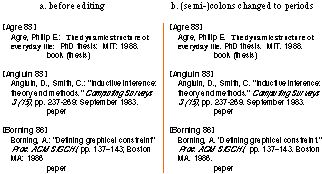 This next example introduces a new case, multiple authors (see the third entry in Figure 1). Turvy's search pattern was "word before first colon in the paragraph," which selects the last author. Note that Turvy rejects the generalization "any punctuation" for two reasons: words before periods ("E.", "H.") were not given as examples; and Kate said "comma."