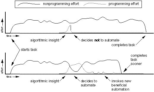 Just-in-time programming research, however, is focused on making programming easier for a specific cross section of situations. These situations are primarily defined by the user programming during task-time. In other words, the user attempts to write a program for a task that is already in progress. Figure 1 summarizes the relationship between task progress and the user's expenditure of effort. The expenditure of effort for just-in-time programming is shown separately from the other task related effort. The difficulty of just-in-time programming results from the spreading of the user's mental resources between two activities [Cypher 86]. Another difficulty is that the time spent programming contributes directly to total time between the start and completion of the task.
