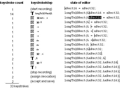 The line transformation subtask is typical of many subtasks suitable for just-in-time programming in that the benefit gained from each invocation is small. One popular invocation strategy, especially with keyboard macros, is a specially assigned keypress. One keypress to transform one of the lines is a satisfactory solution, and certainly does not present an obstacle if just the physical effort is considered. The effort sometimes becomes an obstacle when complexities of the task-time situation plus the effort to remember and properly apply the automation strain the user's attention. Keystrokes can become difficult to remember because most simple keystrokes are already claimed by application programs. Often only convoluted keystrokes like control-option-"L" are available. If several opportunities appropriate for just-in-time programming arise, keeping straight which keystroke goes with which automation can be a challenge.