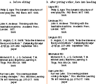 Figure 1. Task 3: Make a heading with author's name and date. This task is one of the most difficult, since it involves parsing lists of people's names, which may include initials, baronial prefixes like "van", and special annotations like "(ed.)". Turvy must learn to find the primary author's surname -- the word before the first comma or colon. It may include a lower case word (like "van"). The date is the last two digits before the period at the end of the paragraph. In some cases the final period is missing; Turvy must ask about this exception. In two of the entries, the author's name and initials are reversed ("Michalski R. S."): Turvy therefore picks the last initial. When the user corrects it, Turvy asks why this case is treated differently, and the user must teach it to skip back over single-letter words ending in a period.